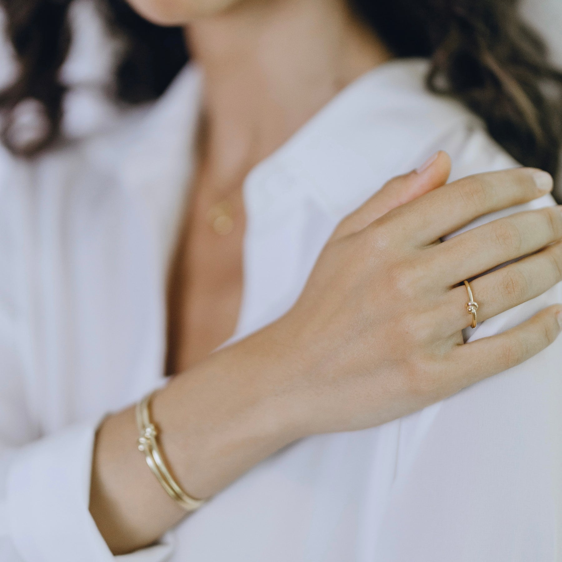 Een elegante knoopring, vervaardigd uit 18K goud vermeil met een hoogglans afwerking. Het minimalistische ontwerp bevat een uniek knoopmotief, dat staat voor eenheid en verbondenheid. Met zijn tijdloze stijl is deze ring een veelzijdig accessoire, perfect voor elke gelegenheid, of hij nu alleen wordt gedragen of gecombineerd met andere favoriete stukken.